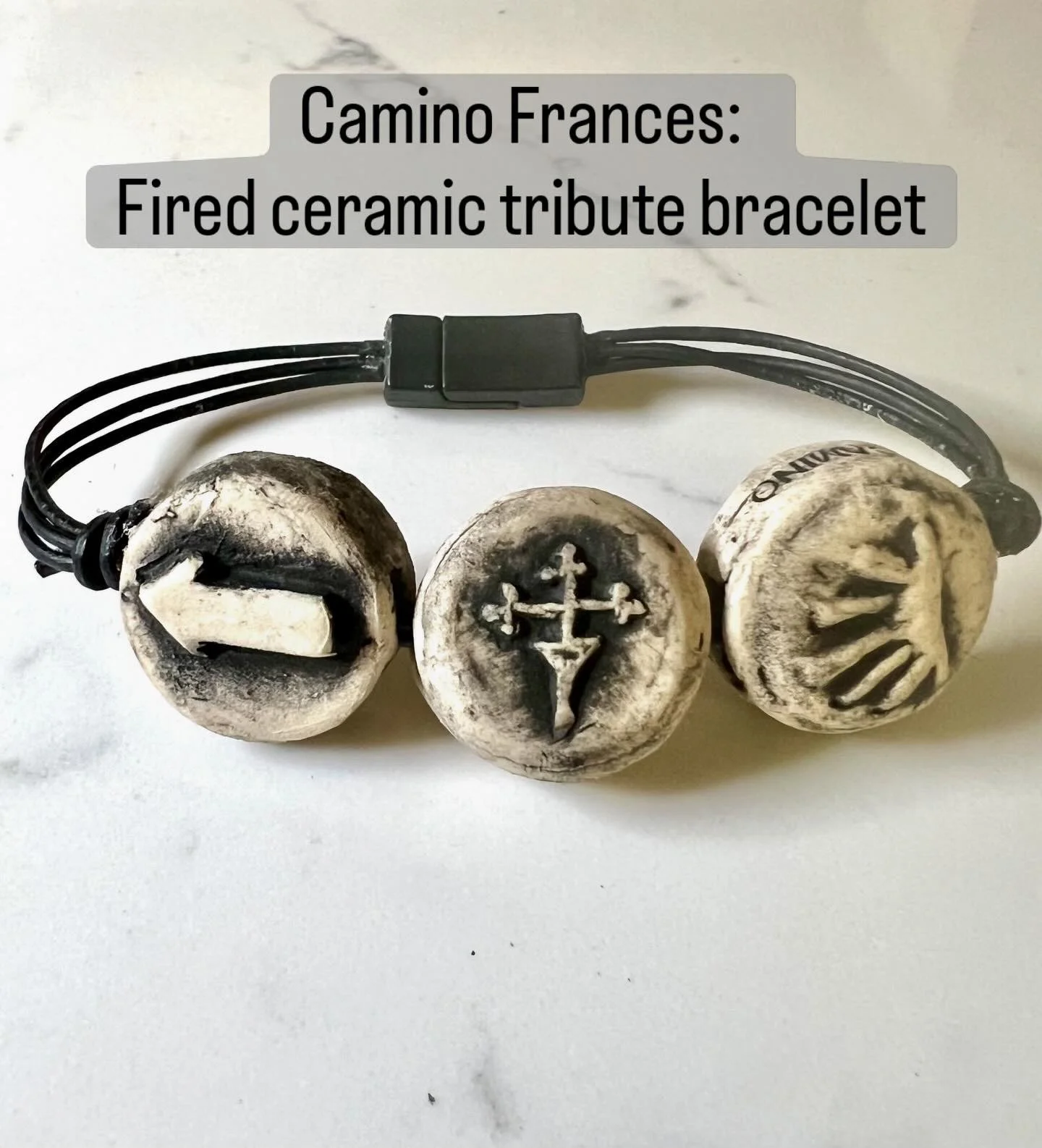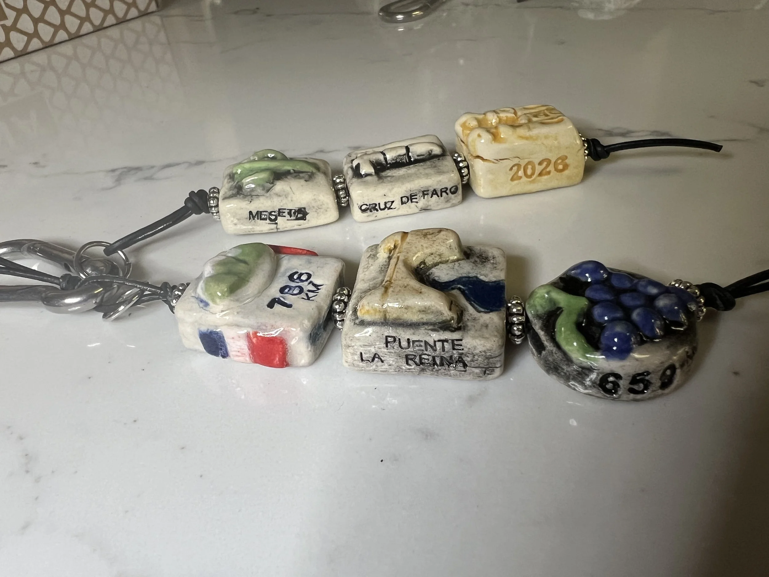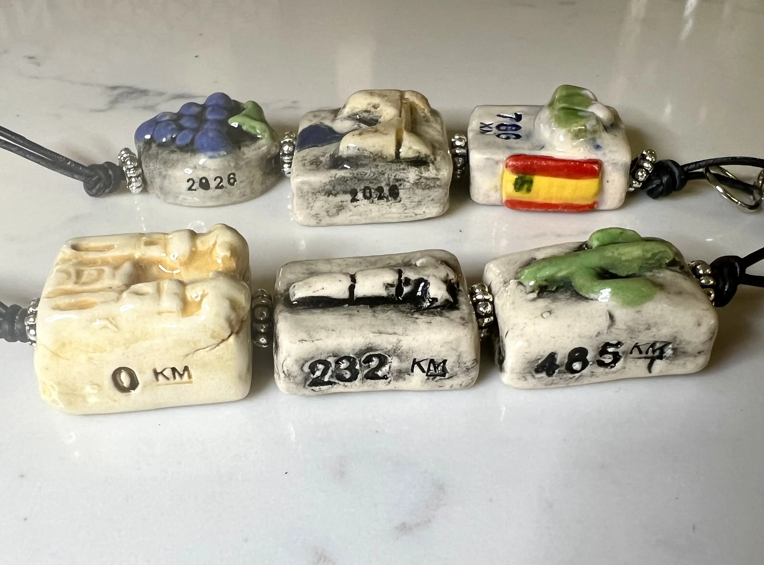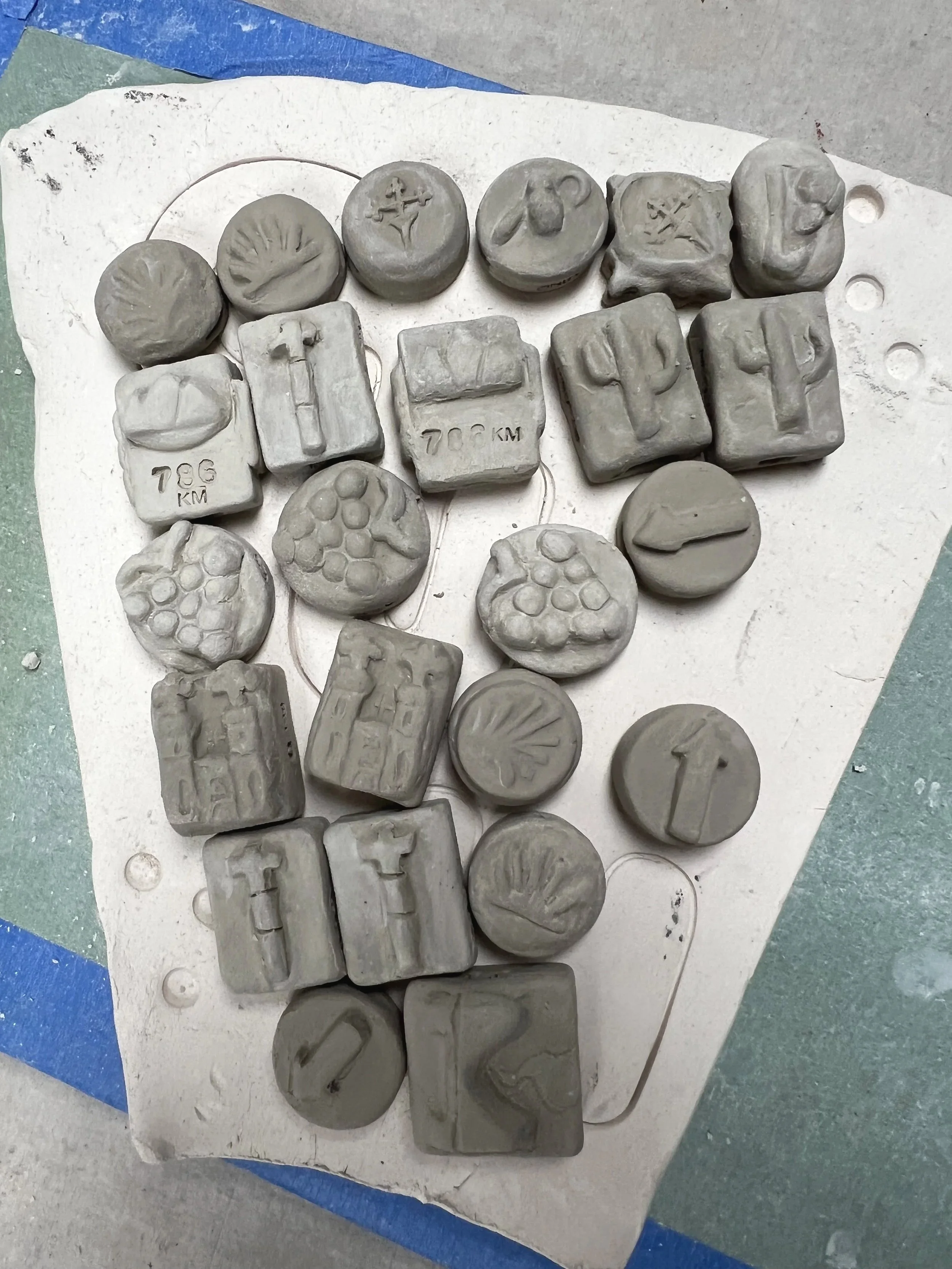 These ceramic medallions were designed to reflect key milestones along the Santiago Frances beginning in St. Jean Pied-de-Port, France and ending at the Cathedral of Santiago de Compostela, Spain.